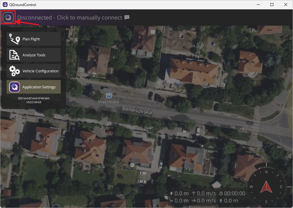 - Open the QGroundControl menu by clicking on the QGroundControl icon in the top left corner and select Application Settings.