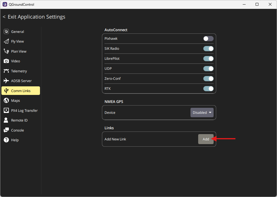 - In the Application Settings window, select Comm Links and then select the Add New Link option to open the Add New Link form.