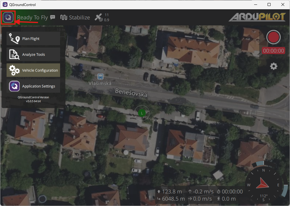 - Open the QGroundControl menu by clicking on the QGroundControl icon in the top left corner and select Vehicle Configuration.