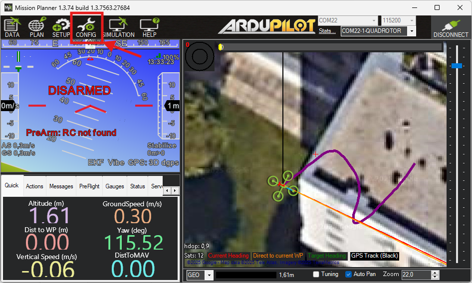 In Mission Planner, configure the connection port and baud rate in the upper right corner of the Mission Planner window. The USB connection baud rate should be 115200. Then press the Connect button. If you need help setting up the connection, follow the ArduPilot with Mission Planner documentation.