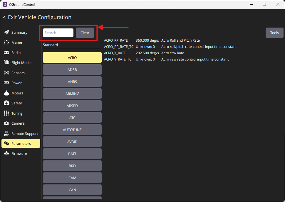 In the Vehicle Configuration window, select Parameters in the menu and then use the parameter search.