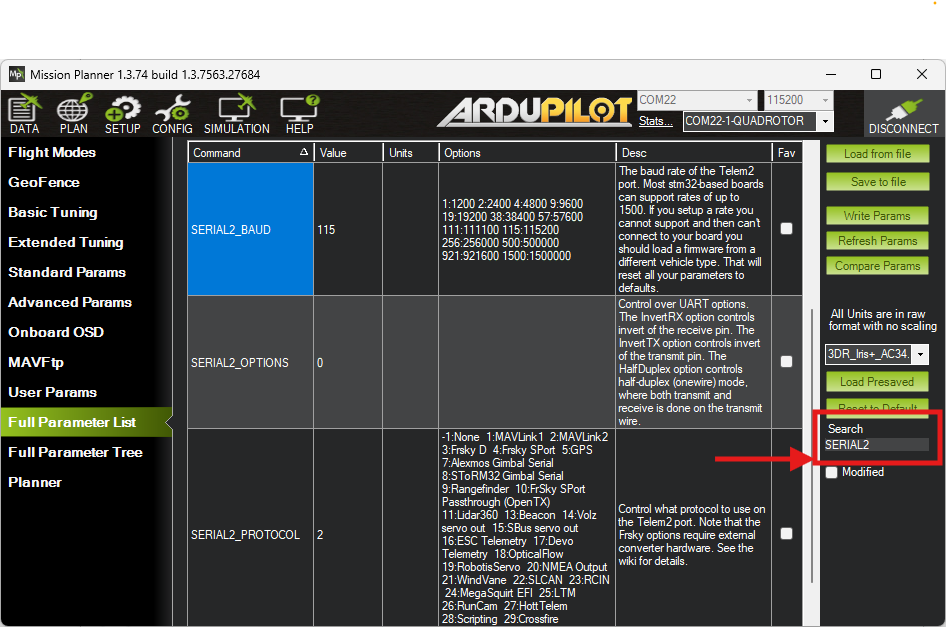 (MAVLink2 protocol)SERIALx_BAUD = 115
